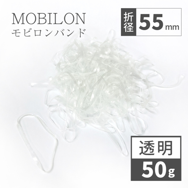 モビロンバンド 折径60mm カット巾3mm 透明 50g(約347本)入り と同時に購入しました。輪ゴムより薄く、匂いもないのでいろいろ工夫して使えそうです。ありがとうございました。